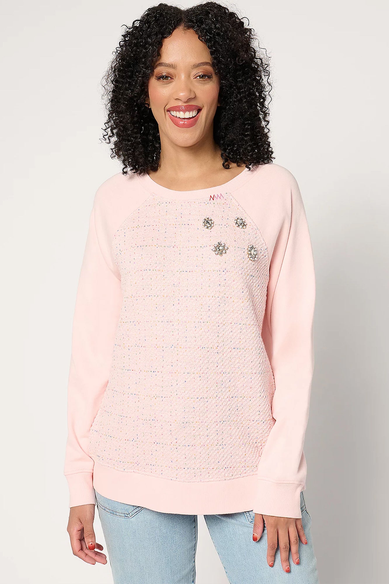 - Features: embellishments, long raglan sleeves, ribbed cuffs and hem