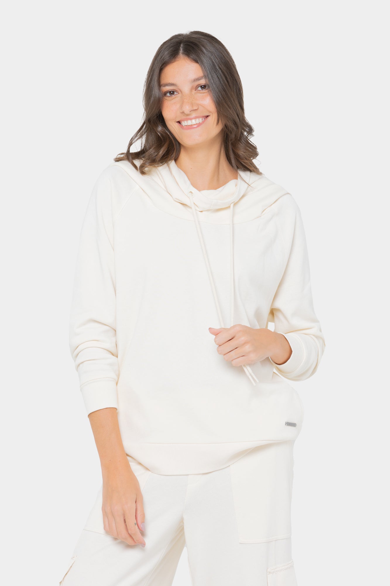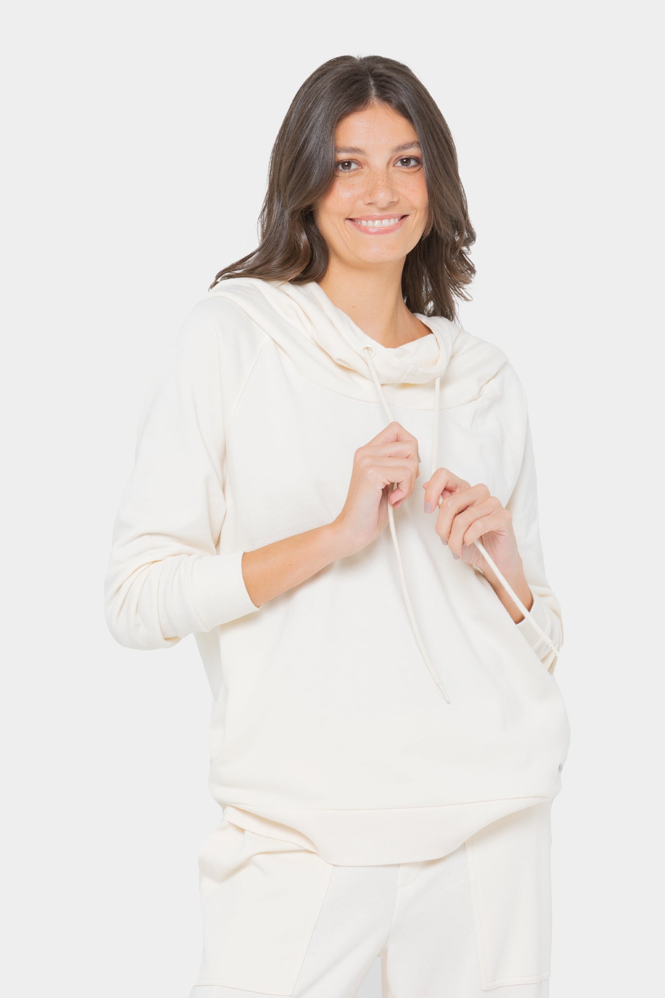 - Features: cowl neck, on-seam pockets, hood with cotton drawcord