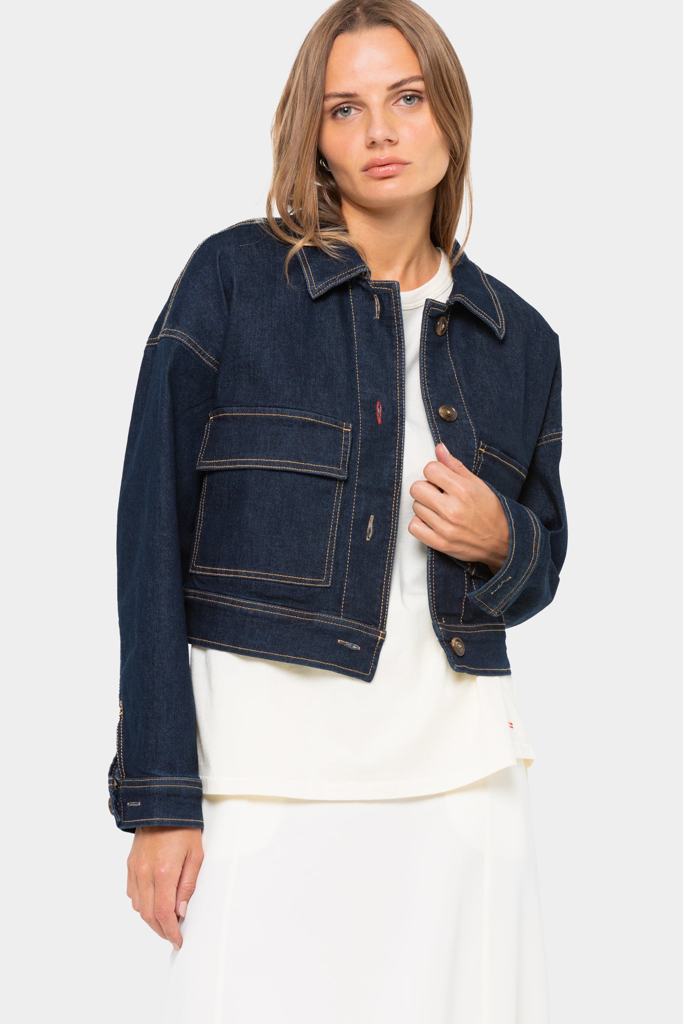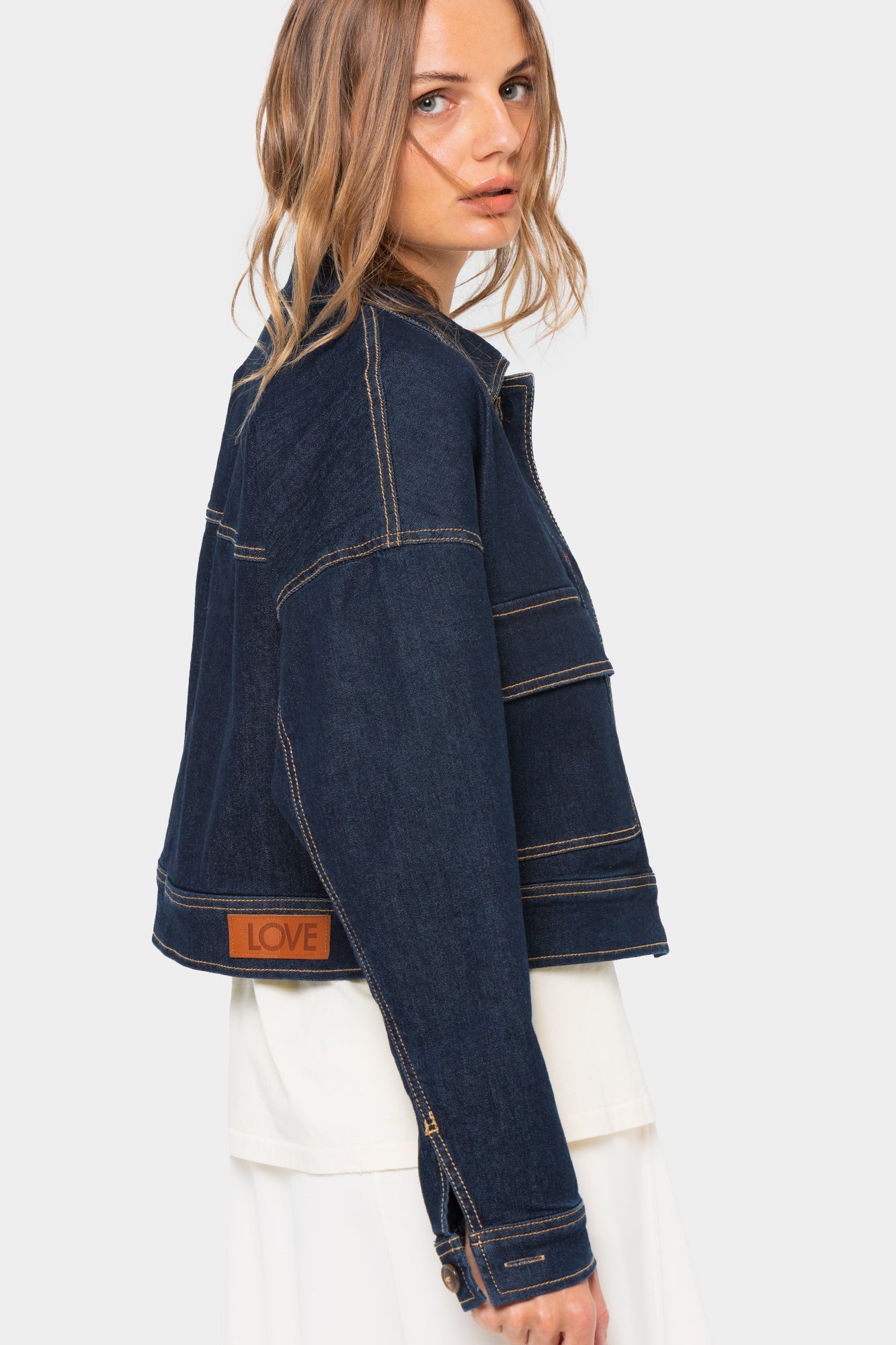 Fabrication: woven. Features: Denim button front cropped jacket, patch pockets with flap, drop shoulder, long sleeve, LOVE patch at back neck. Fit: relaxed- generously cut with maximum wearing ease. Length: Missy- 19-1/2" to 21-5/8", Plus- 22" to 25-1/2". Content: 70% cotton, 20% polyester, 9% rayon, 1% spandex. Care: MWCDC/WS/ONCBWN/TDL/WIIN. Imported. (F)