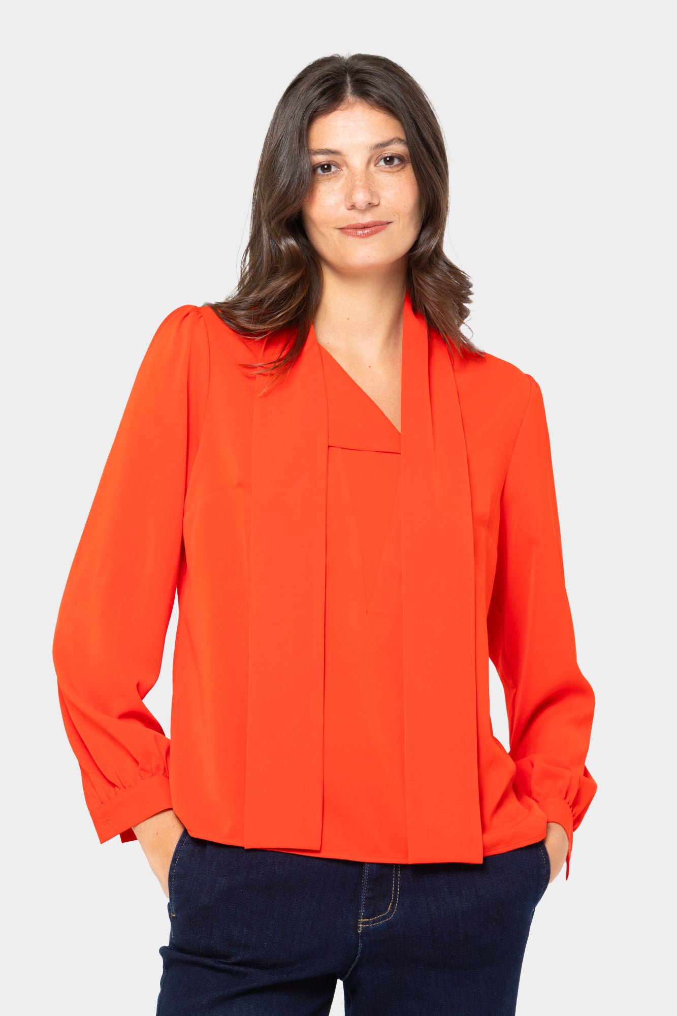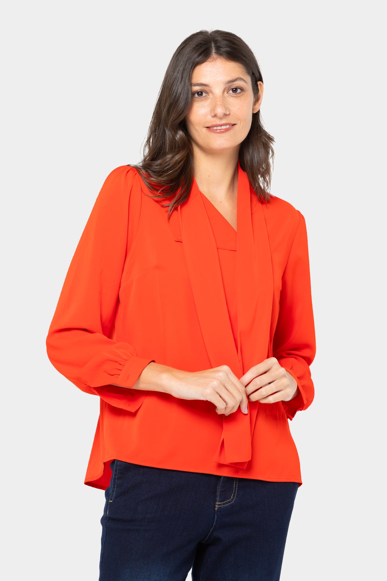 - Features: self ties at neck, hi-low curved hem, folded button cuffs