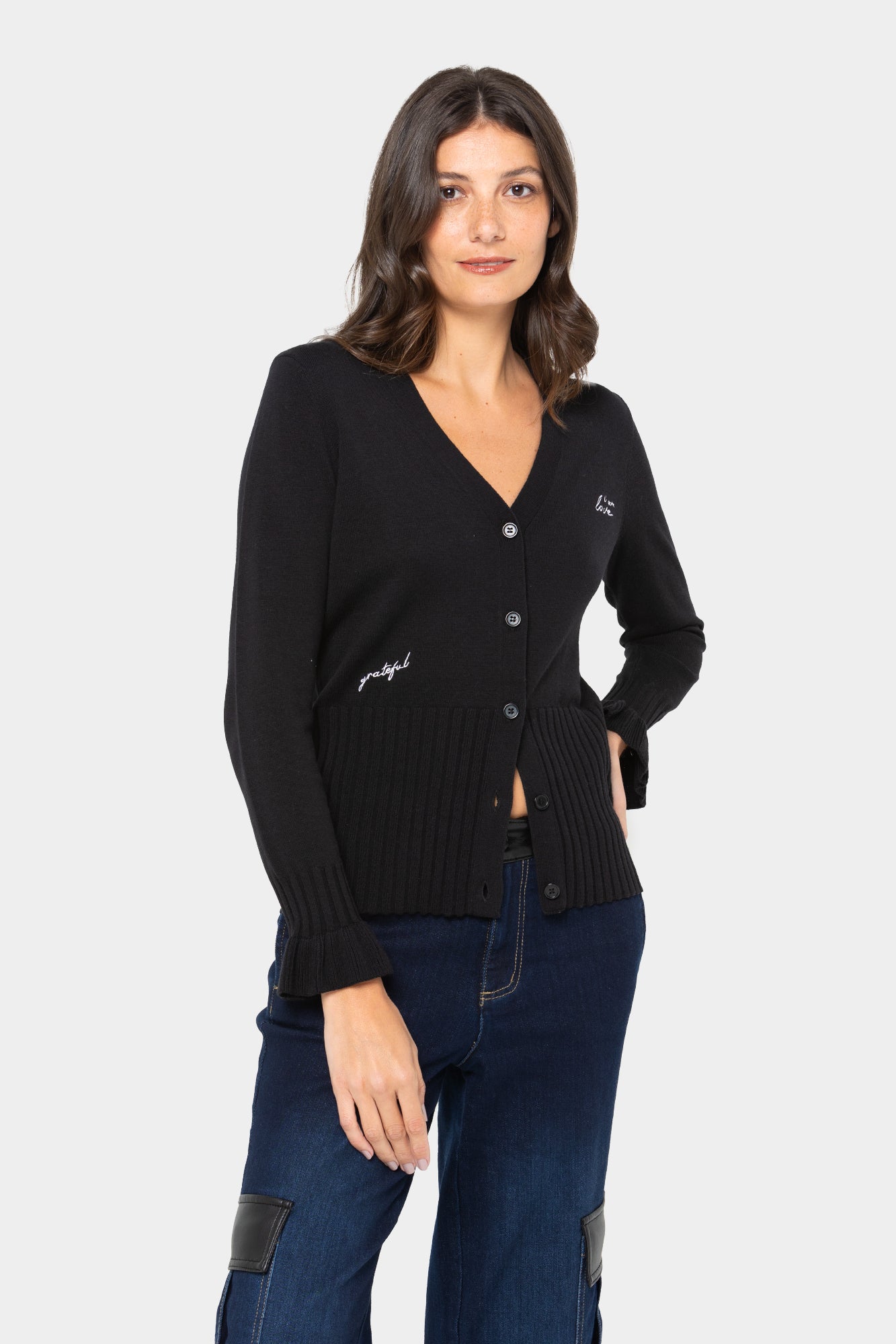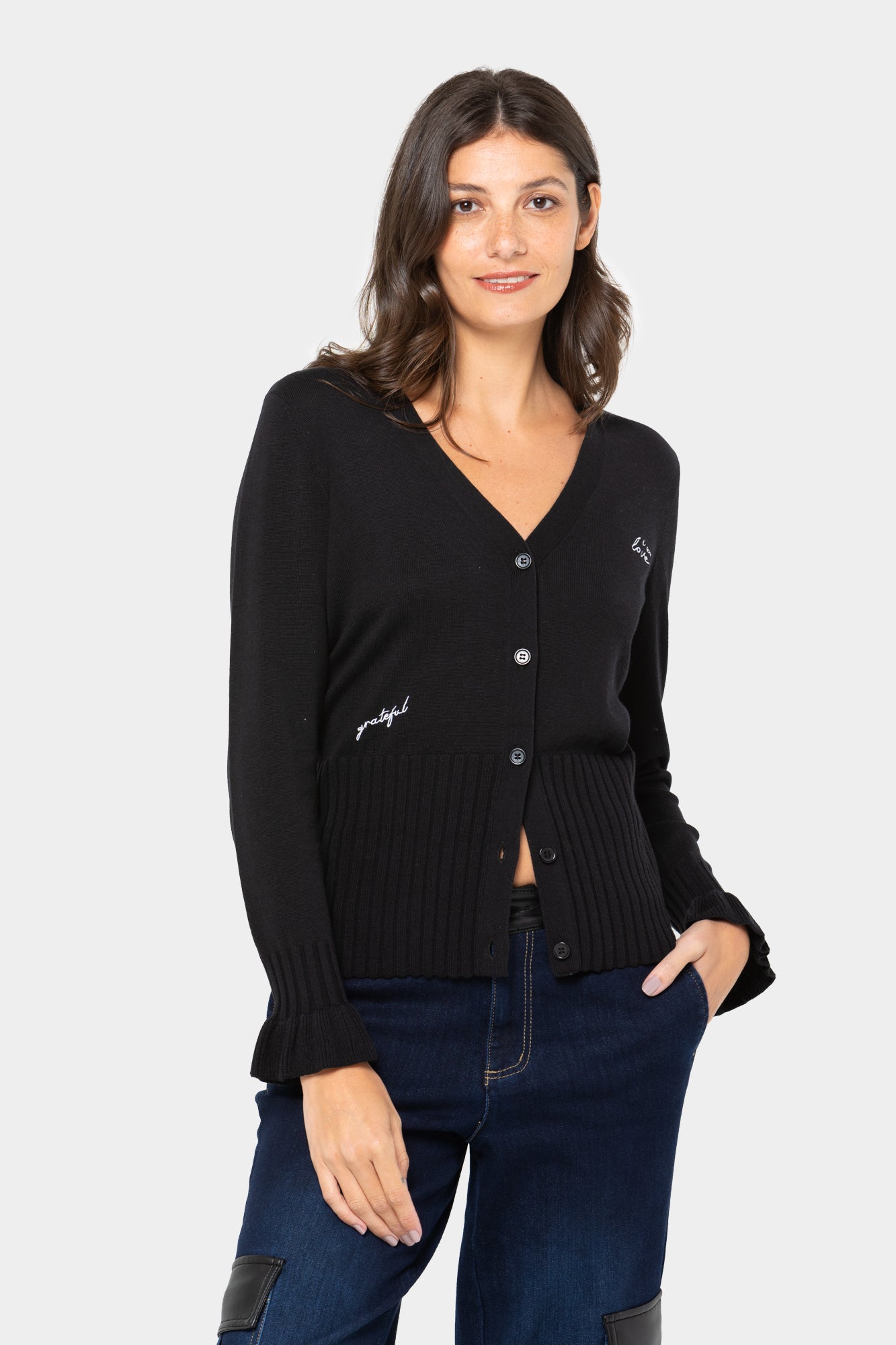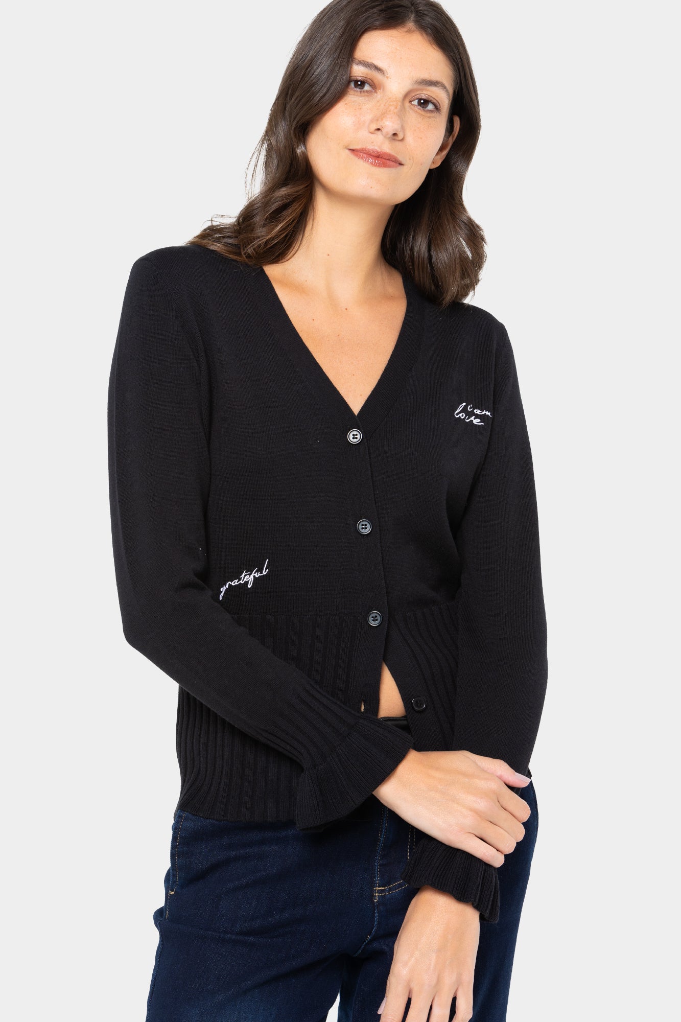 A sophisticated alternative to oversized sweaters, this Black Label cardigan is cut for a closer, shape-flattering fit, with thoughtfully placed ribbing and ruffled cuffs. Its soft, feel-good style is a smart way to balance wide-leg trousers -- and embrace positivity (zoom in on the charming embroidery!).