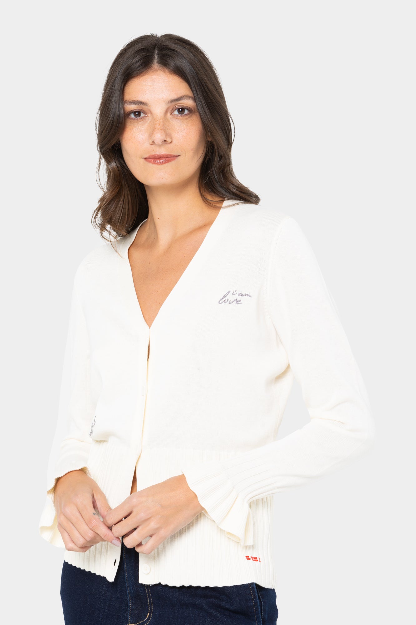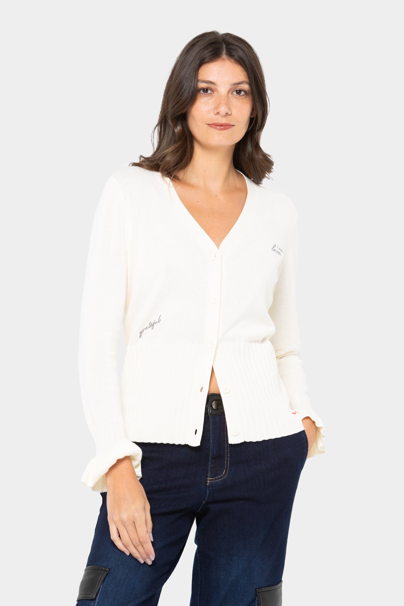 A sophisticated alternative to oversized sweaters, this Black Label cardigan is cut for a closer, shape-flattering fit, with thoughtfully placed ribbing and ruffled cuffs. Its soft, feel-good style is a smart way to balance wide-leg trousers -- and embrace positivity (zoom in on the charming embroidery!).