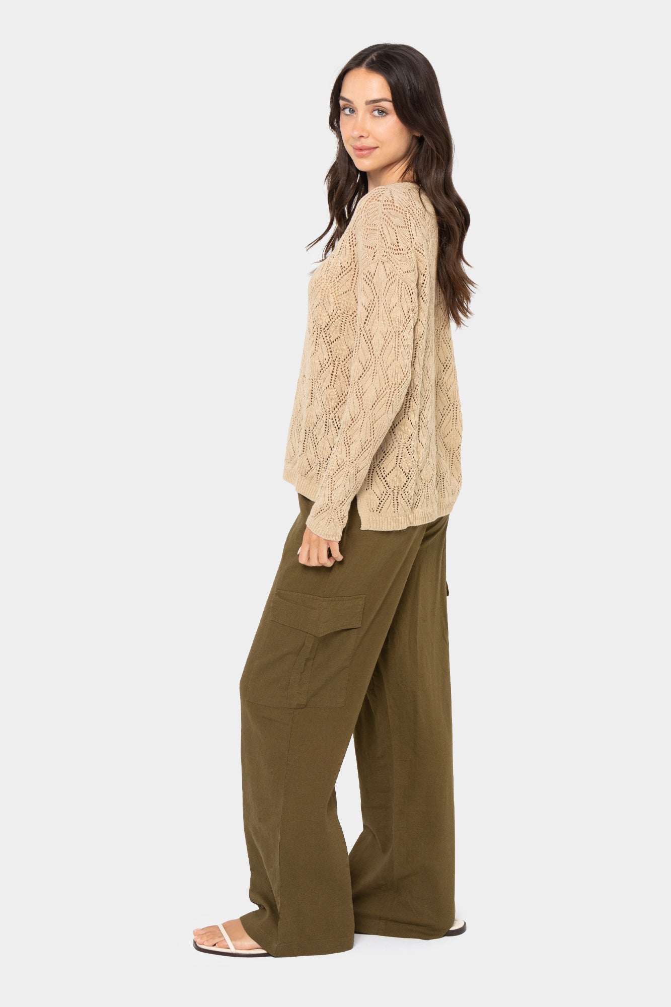 • Features: elasticated waistband with functional drawcord, ruffle details at top, front slash pocket, oversized cargo pockets with center box pleat, flap finish at both side legs, full leg hem