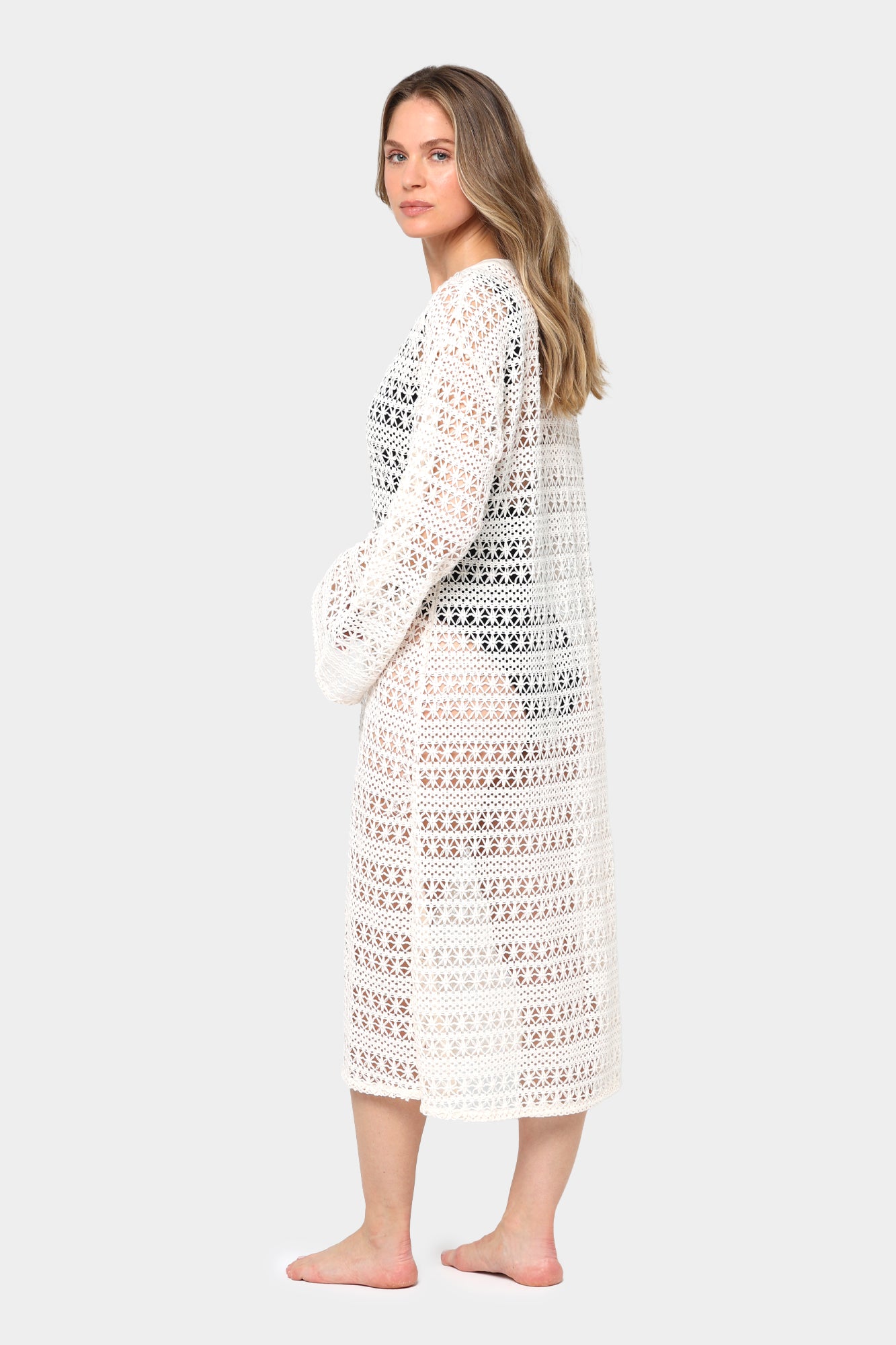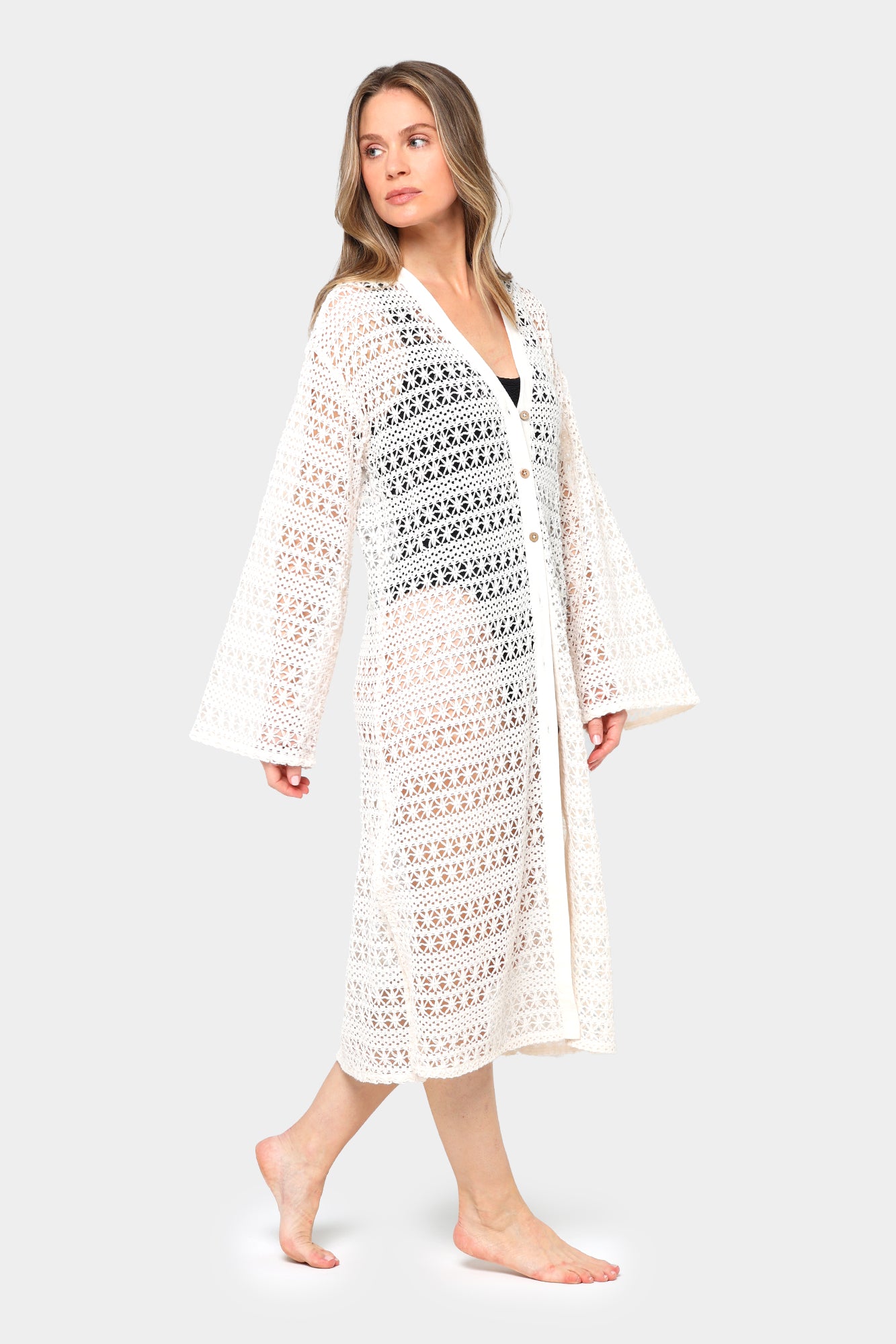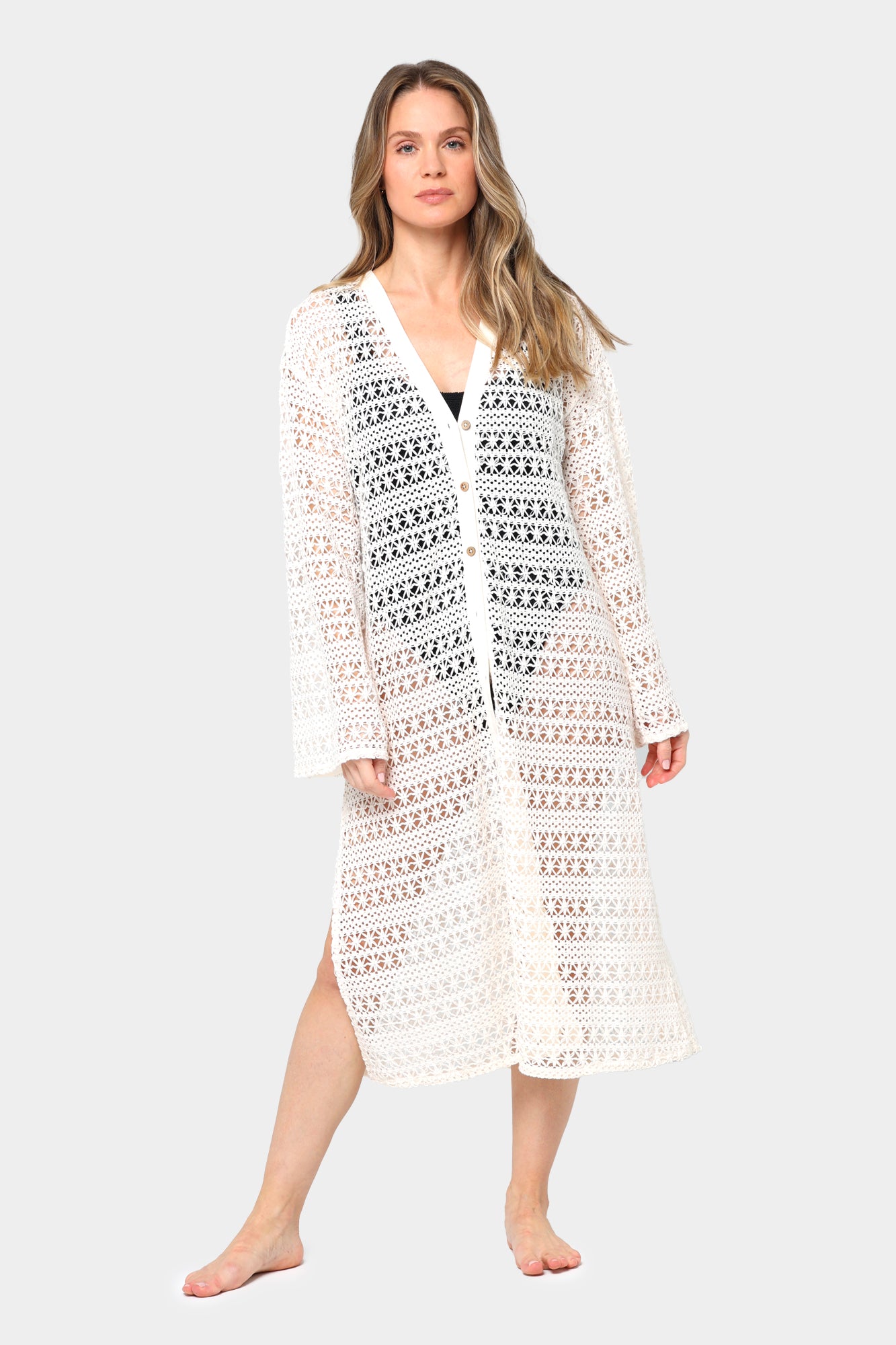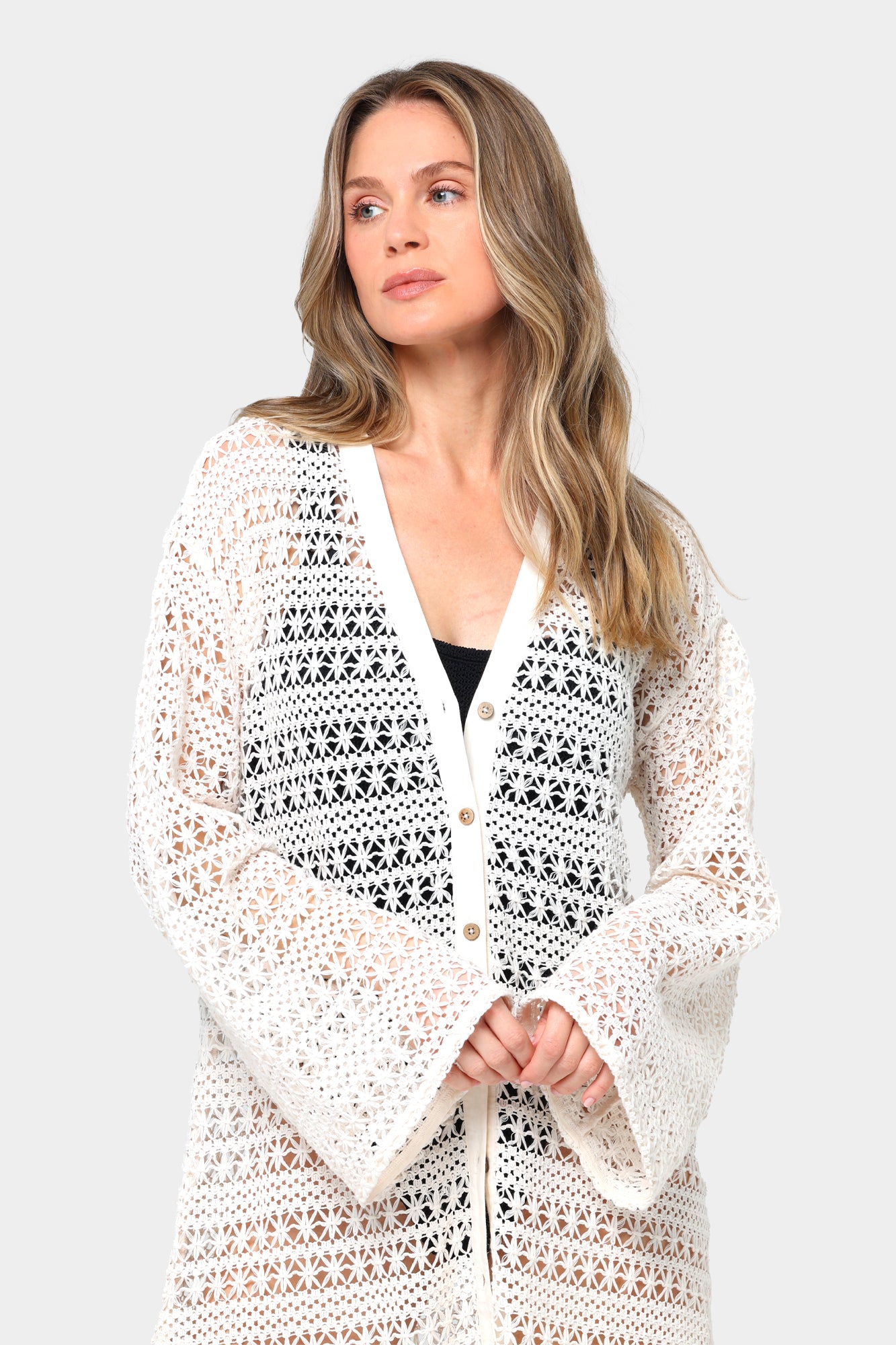 Sweater weather: spring edition. Swap out the fuzzy fleece and cable knits for this free-spirited crocheted duster. Equally boho breezy and beautiful over closet basics as it is a floral sundress.