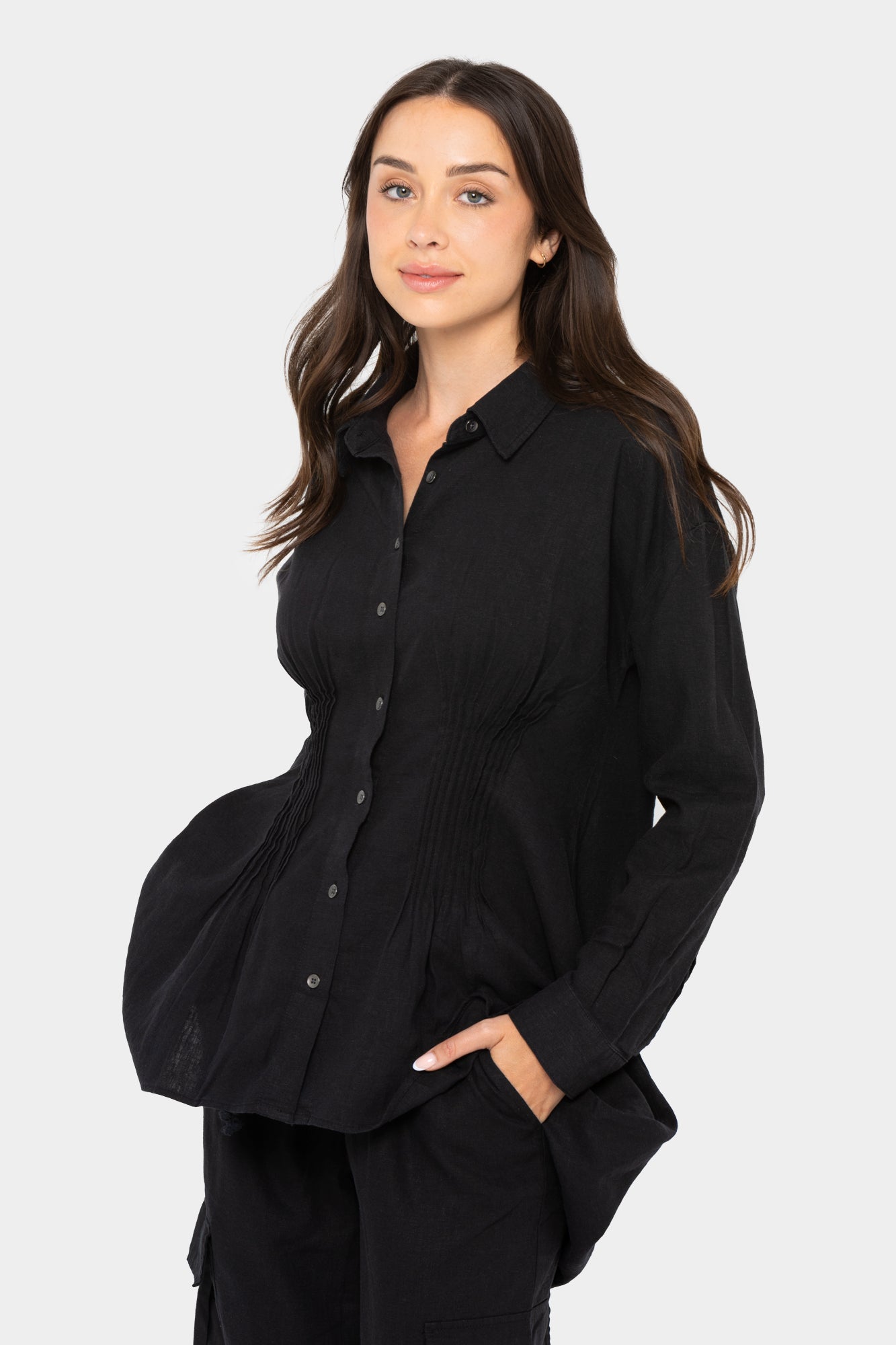 When the occasion calls for something with a little more coverage (sorry, tees and tanks), be prepared with this pintucked pick. The linen-rayon blend keeps things fluid and lightweight, and the sharkbite hem adds the visual interest you crave. Front and back pintucking detail draws the waist in, giving the shirt (and your look) a flattering shape.