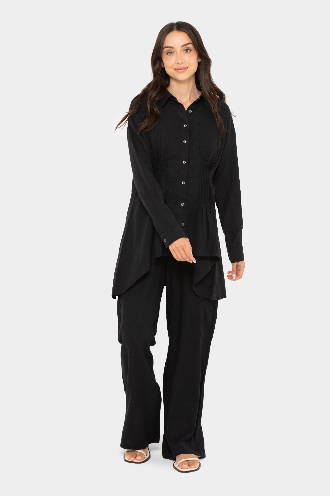 • Features: stand collar, button front closure, dropped shoulder, long sleeves with button and vent cuff, front and back pintuck details, hi-low sharkbite bottom hem