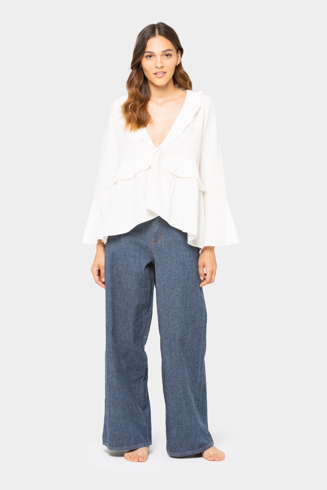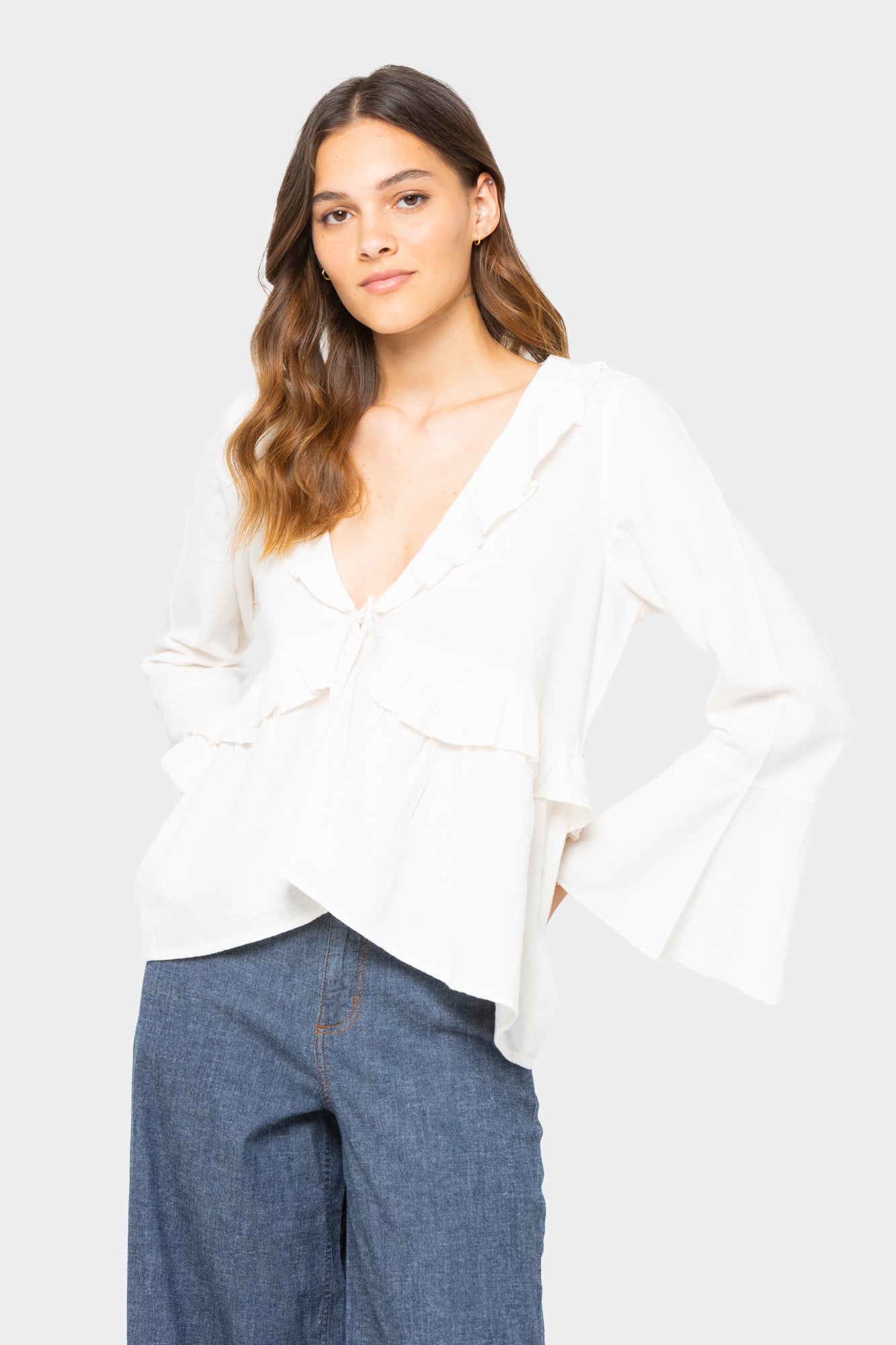 Boho Boheme. Romance is in the air (or at least in your closet) with this Peace Love World all-cotton topper. With feminine ruffle details tracing the waist and neckline, plus long billowy sleeves, it's a free-spirited, feel-good layer whether you're dressing up your daily denim or accenting a special occasion dress. The self-tie closure lets you wear it open, or cinch it for a little extra shape.