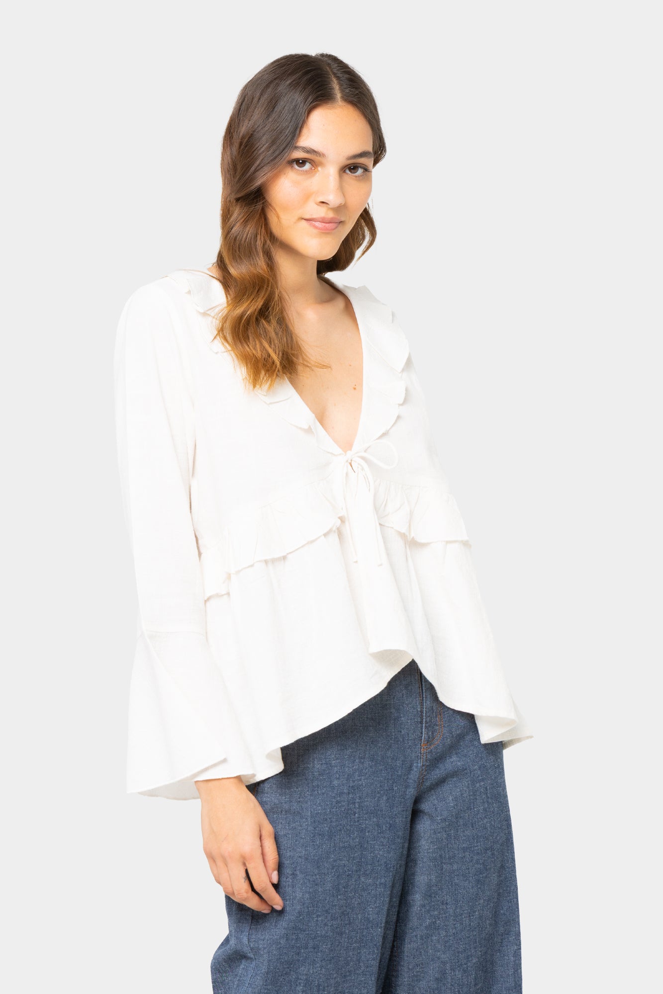 - Features: long sleeves, ruffle detail along waist seam and neckline, self-tie closure