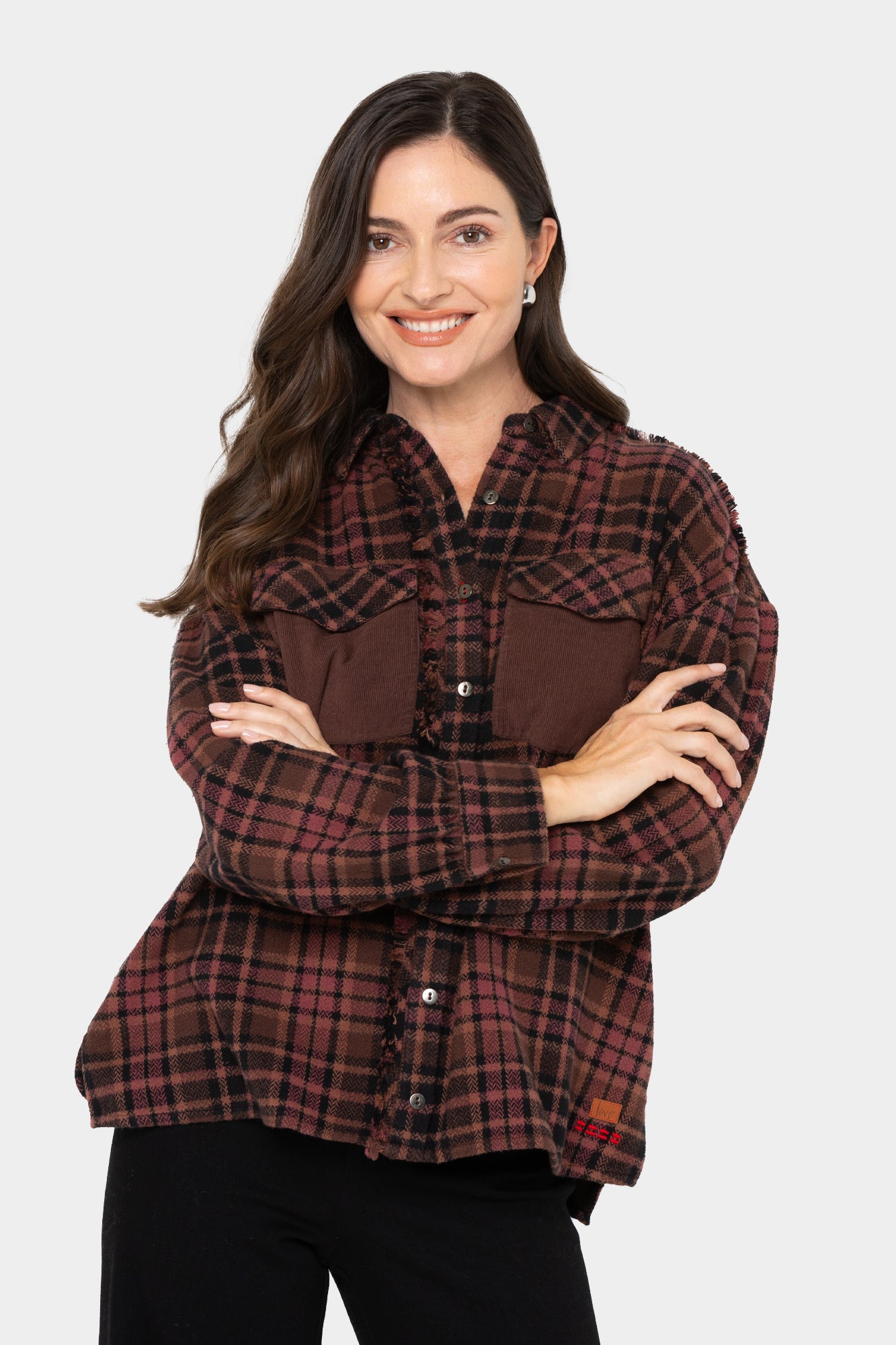 • Features: button front, plaid, long sleeves, chest pockets, side-seam pockets, shoulder seam with fray edge, fraying on back yoke