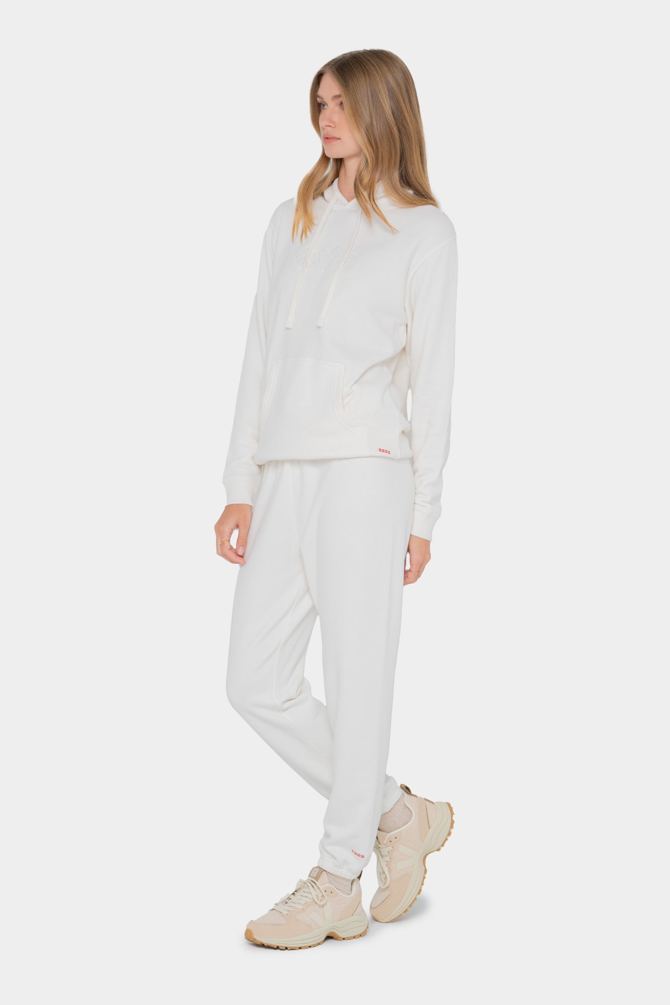 The hooded sweatshirt features an oversized fit, adjustable drawstrings, a thick waistband, and an embroidered 3 symbol logo at the center with our signature red dash-marks at the bottom right.