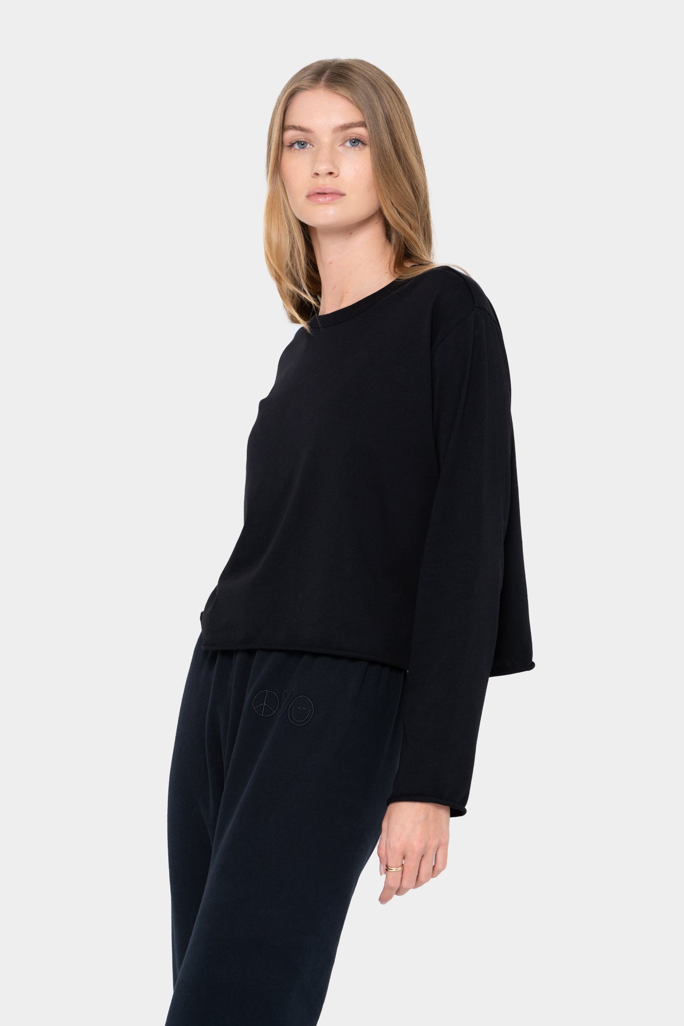 The long sleeve tee features an oversized fit, cropped length, raw edges and an embroidered with our signature red dash-marks at bottom right.