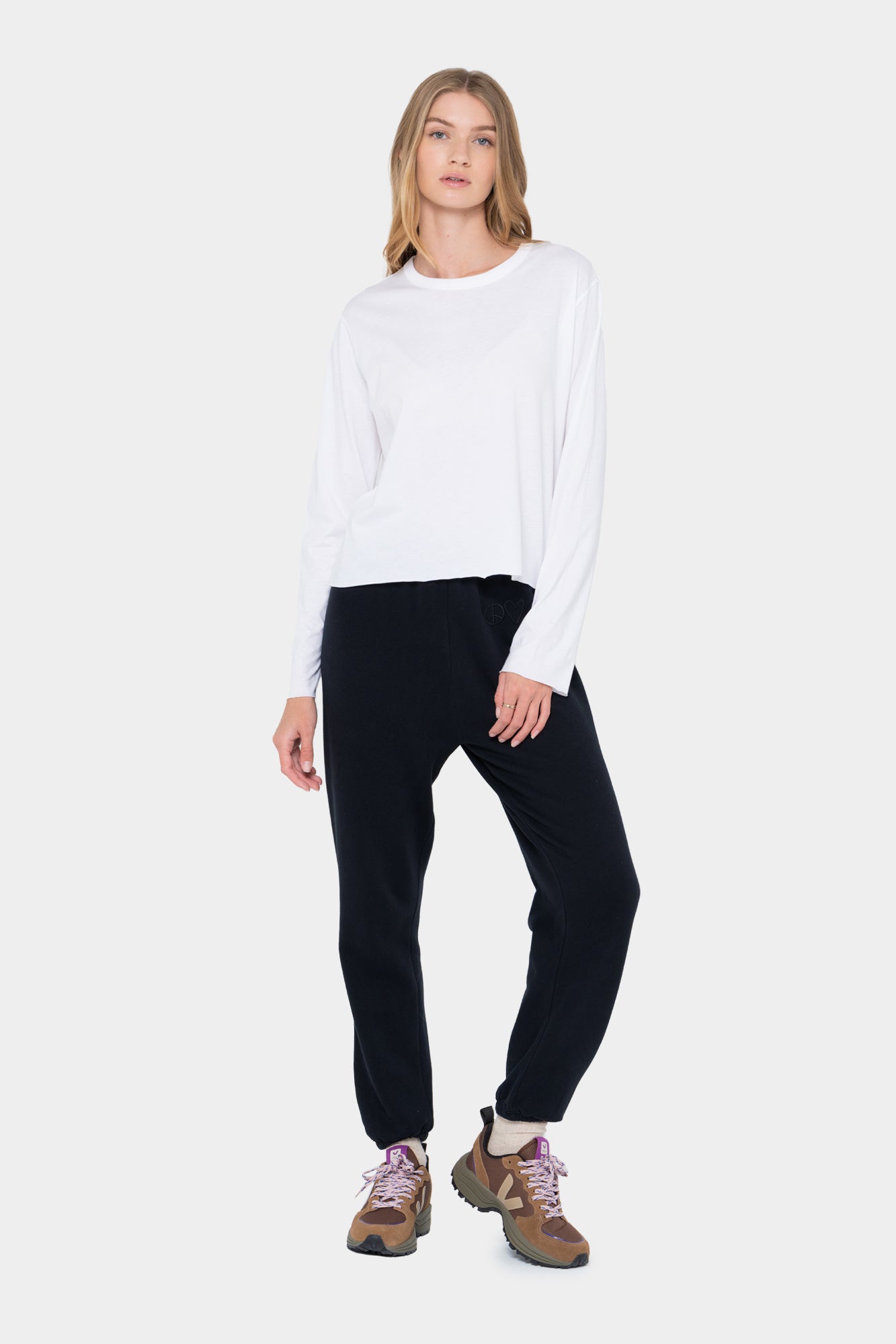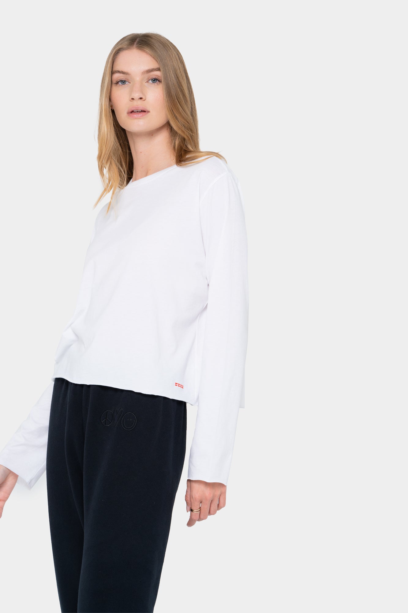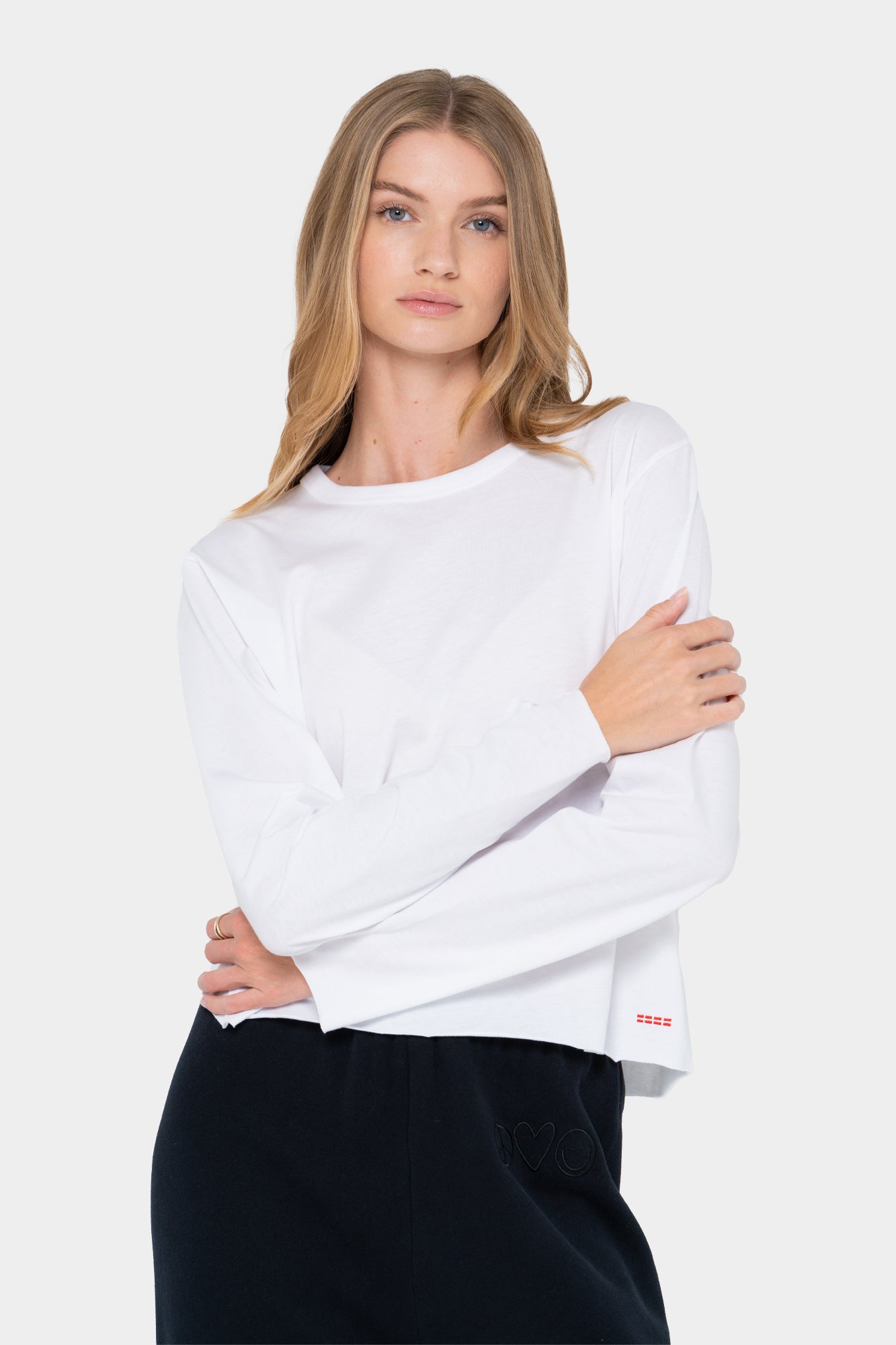 The long sleeve tee features an oversized fit, cropped length, raw edges, and is embroidered with our signature red dash marks at the bottom right.