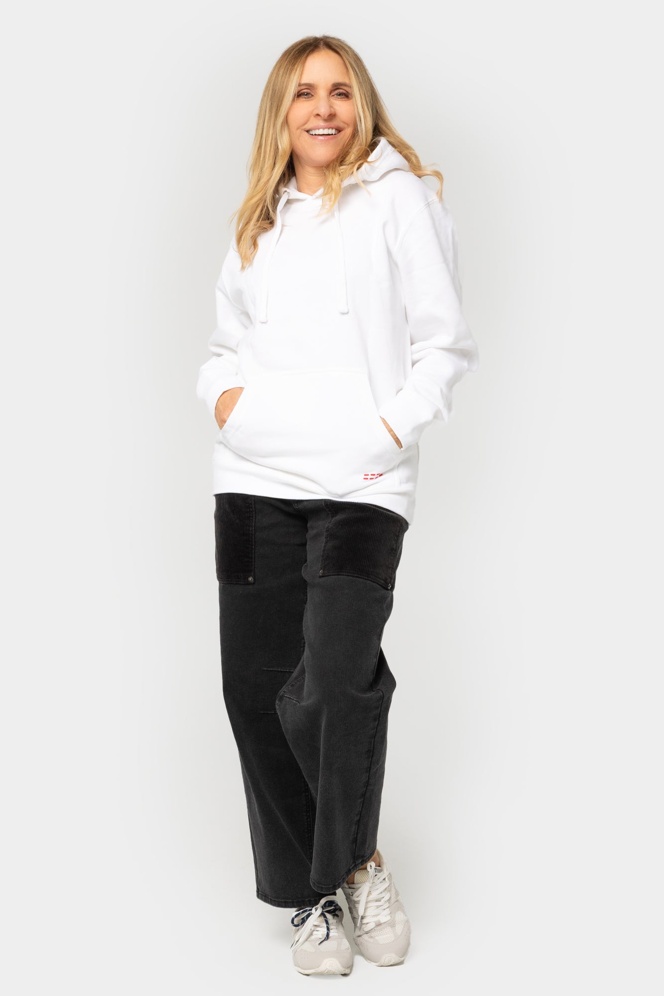 The hooded sweatshirt features an oversized fit, adjustable drawstrings, a thick waistband and an embroidered 3 symbol logo at the center with our signature red dash-marks at the bottom right.