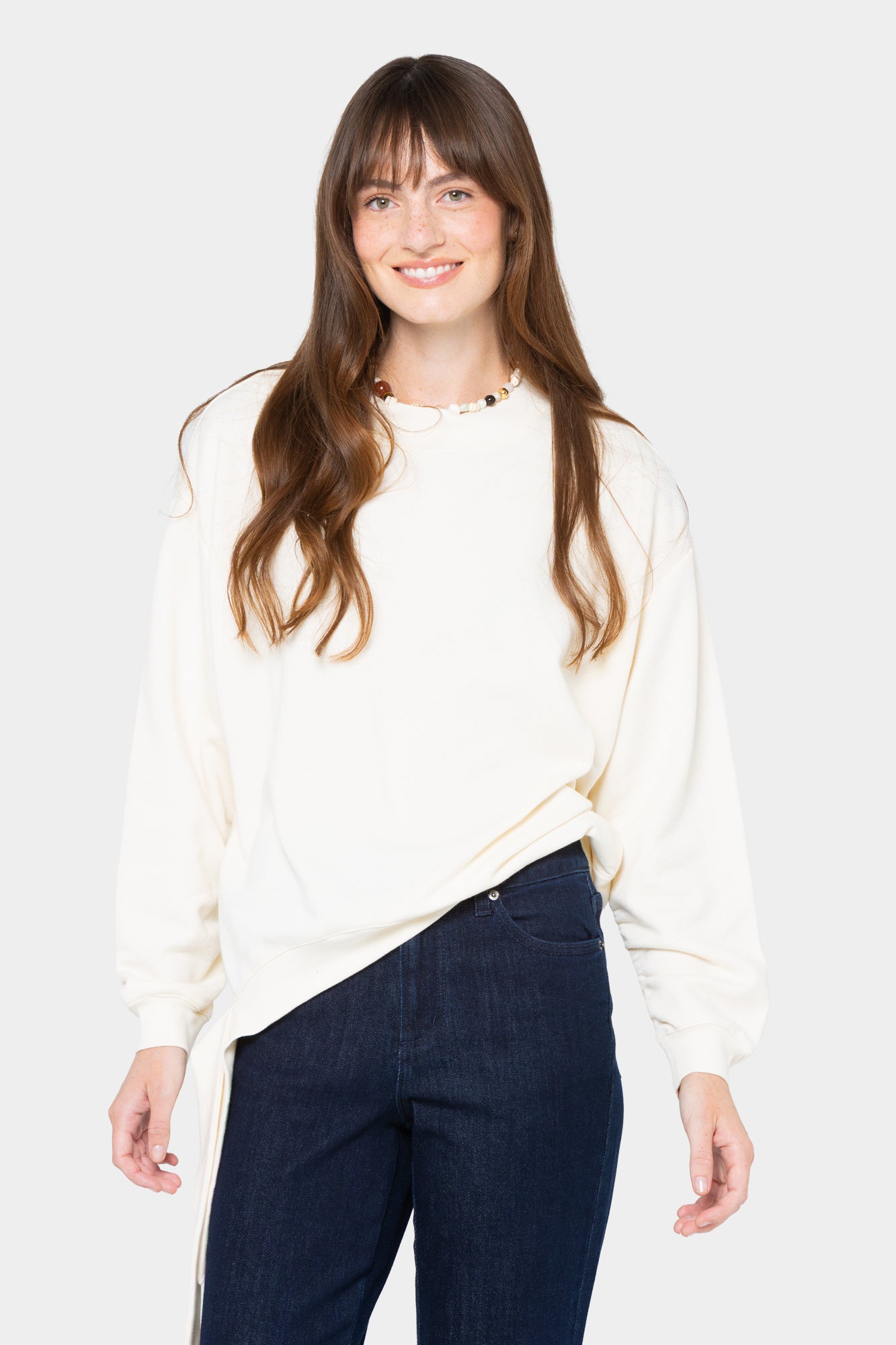 When your weekend plans call for easy comfort with a stylish twist, reach for this French terry sweatshirt. Ruched sleeves and a drop-shoulder detail bring a fresh look, while the side tie and elliptical hem add a playful finish.