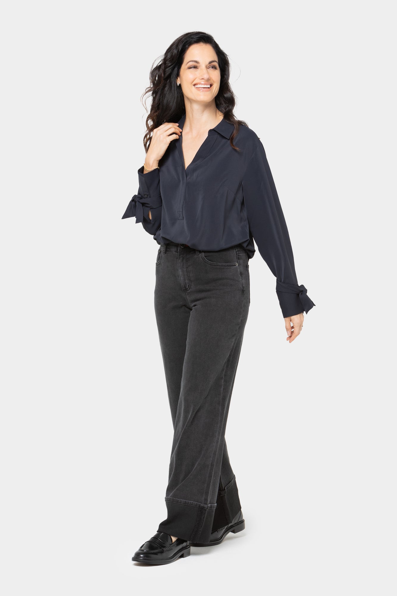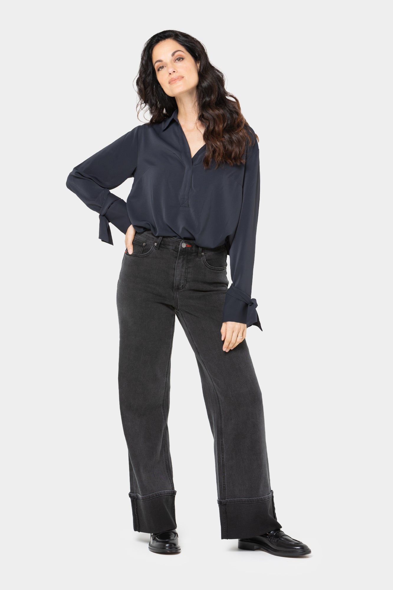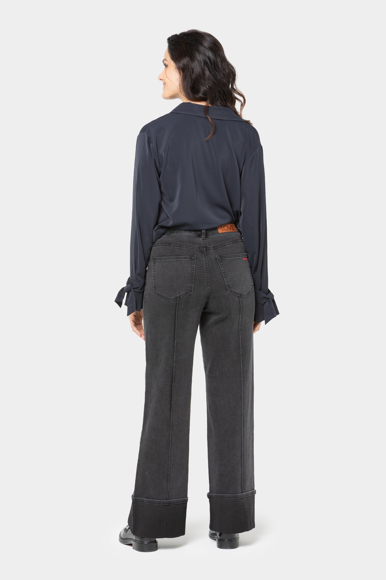 - Leg Shape: full leg; widens slightly from thigh to leg opening