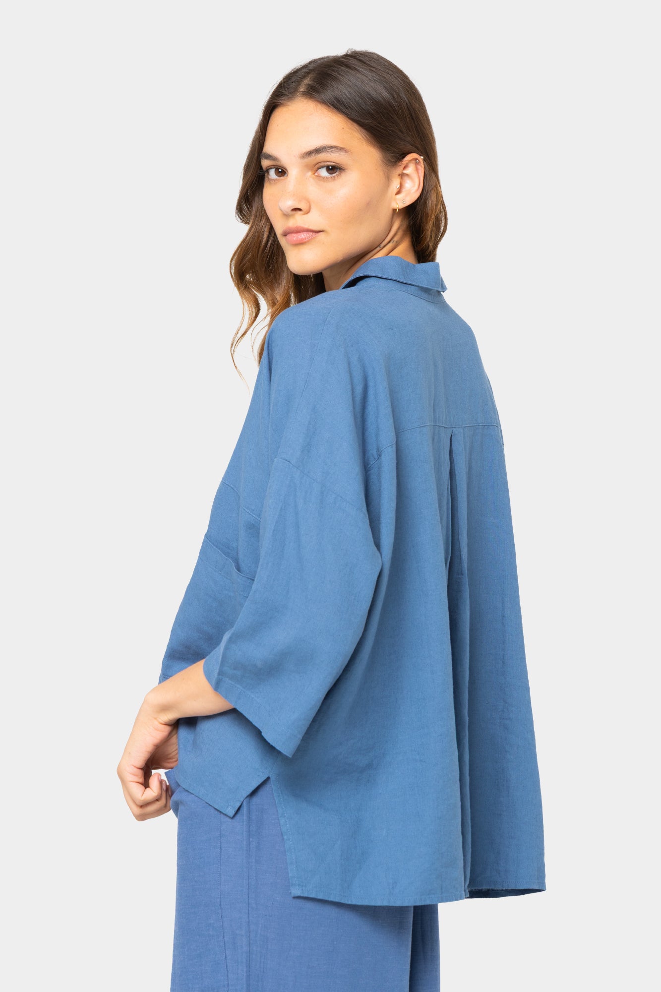 - Features: short sleeves, button front, patch pockets at front, drop shoulder, front yoke details, high-low straight hem with side slits