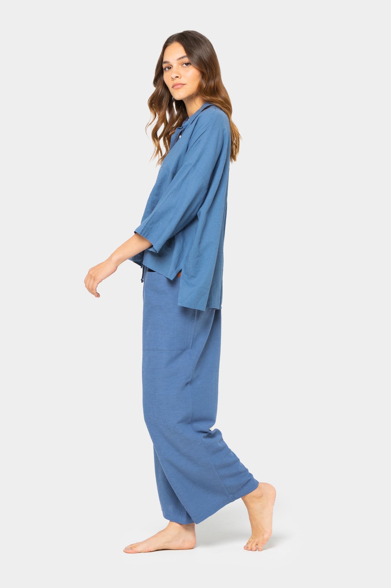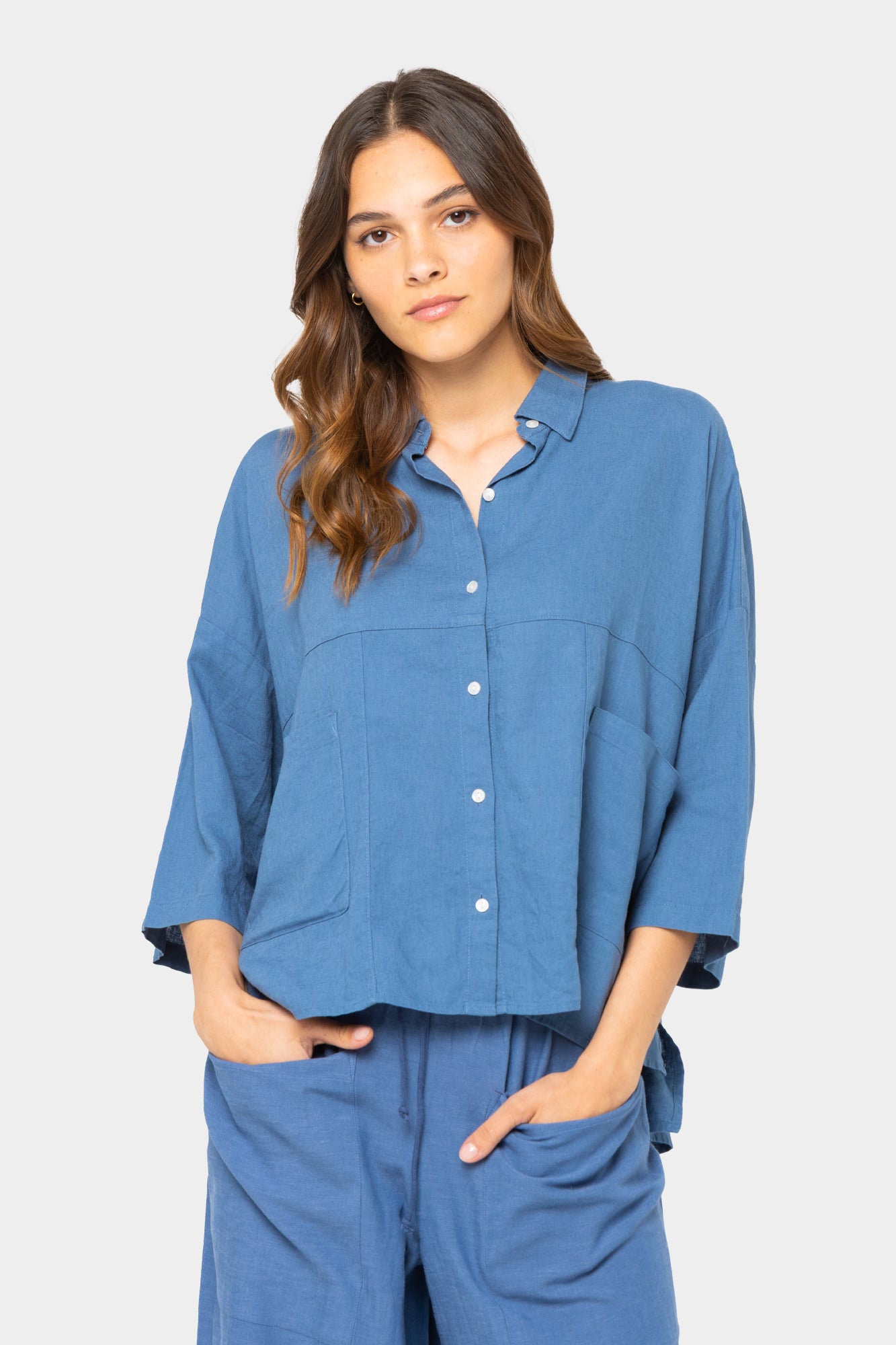 Elevate your casual look with this Boheme linen blend shirt, perfect for a comfortable and confident look. With a button-front design and patch pockets, it's a nod to effortless chic. The drop shoulders and high-low hem add whimsical flair, making it great for layering over jeans or shorts. Whether for a laid-back day in the park or a weekend brunch, this shirt brings relaxed elegance to your ensemble.
