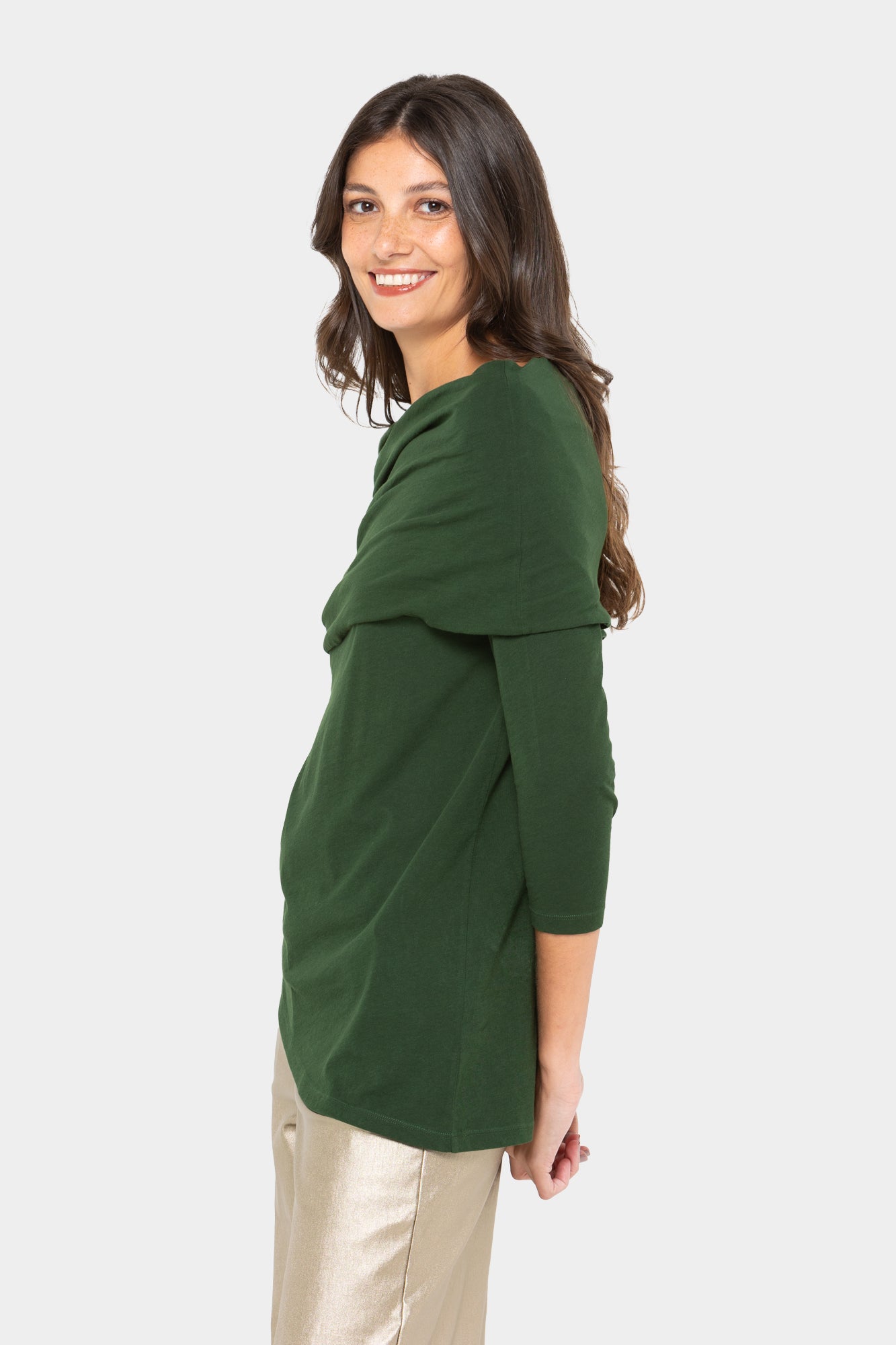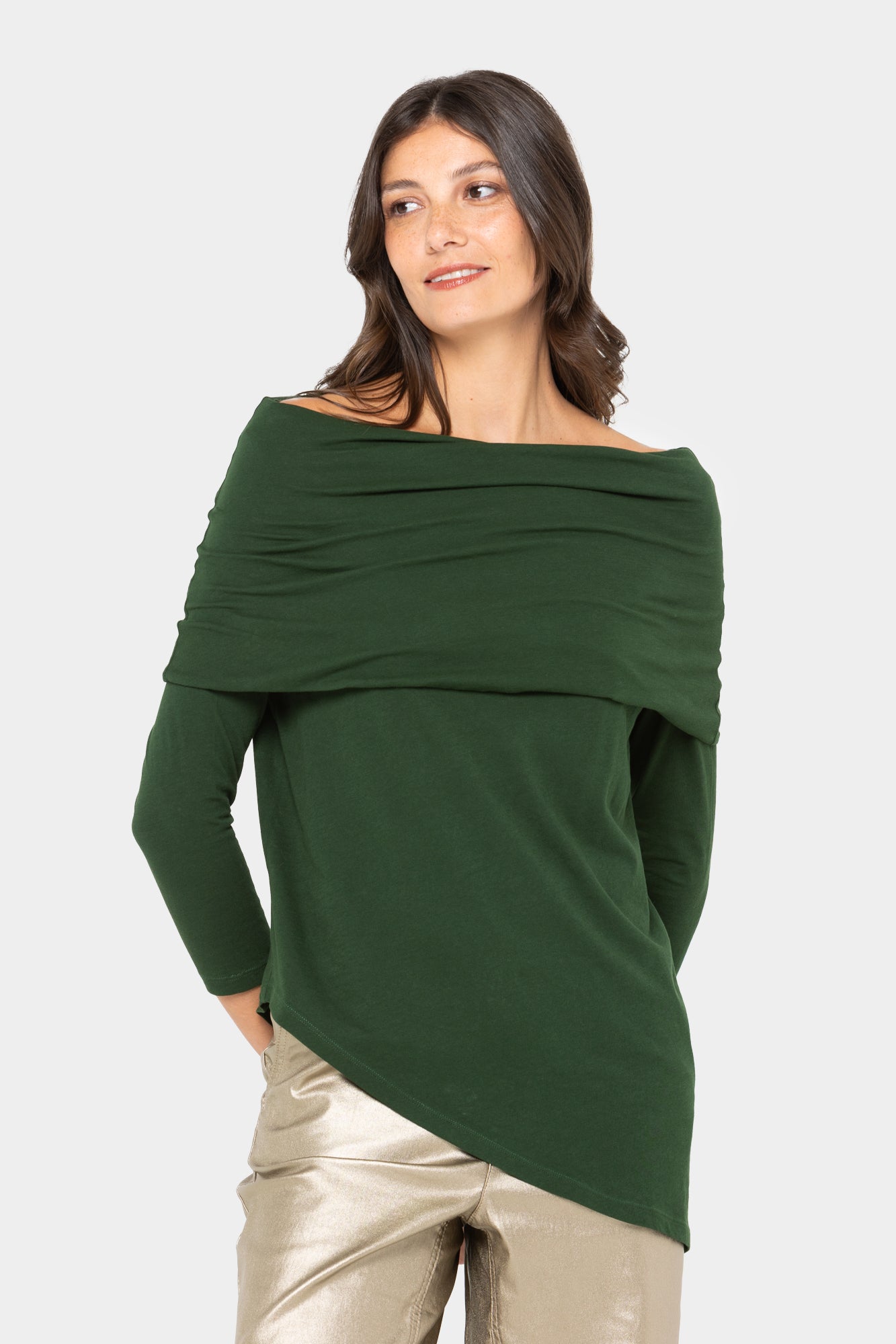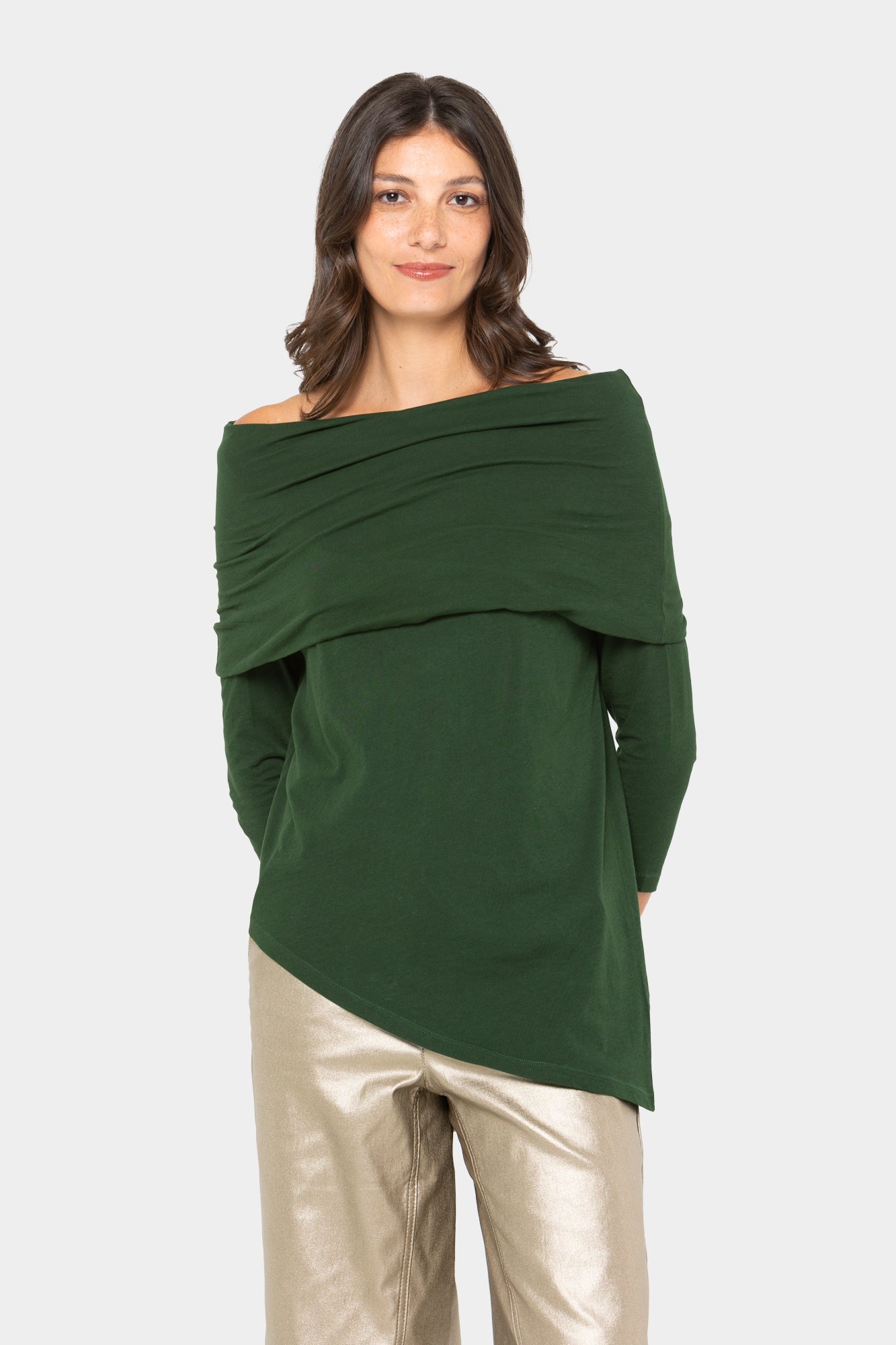 - Features: side cowl, long sleeves, asymmetrical hemline