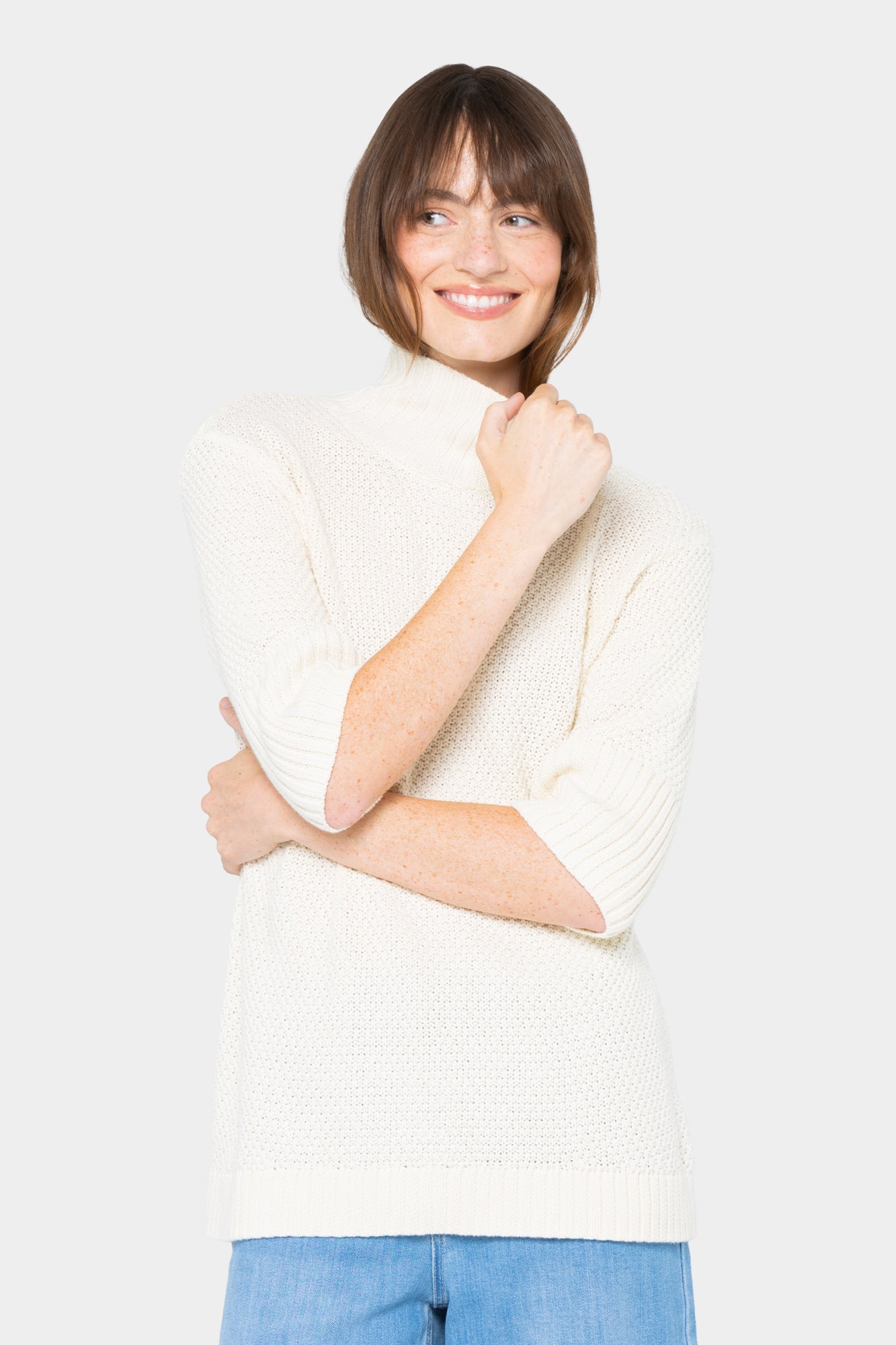- Features: elbow-length sleeves; turtleneck; slight drop shoulder; ribbed neck, cuffs, and hem