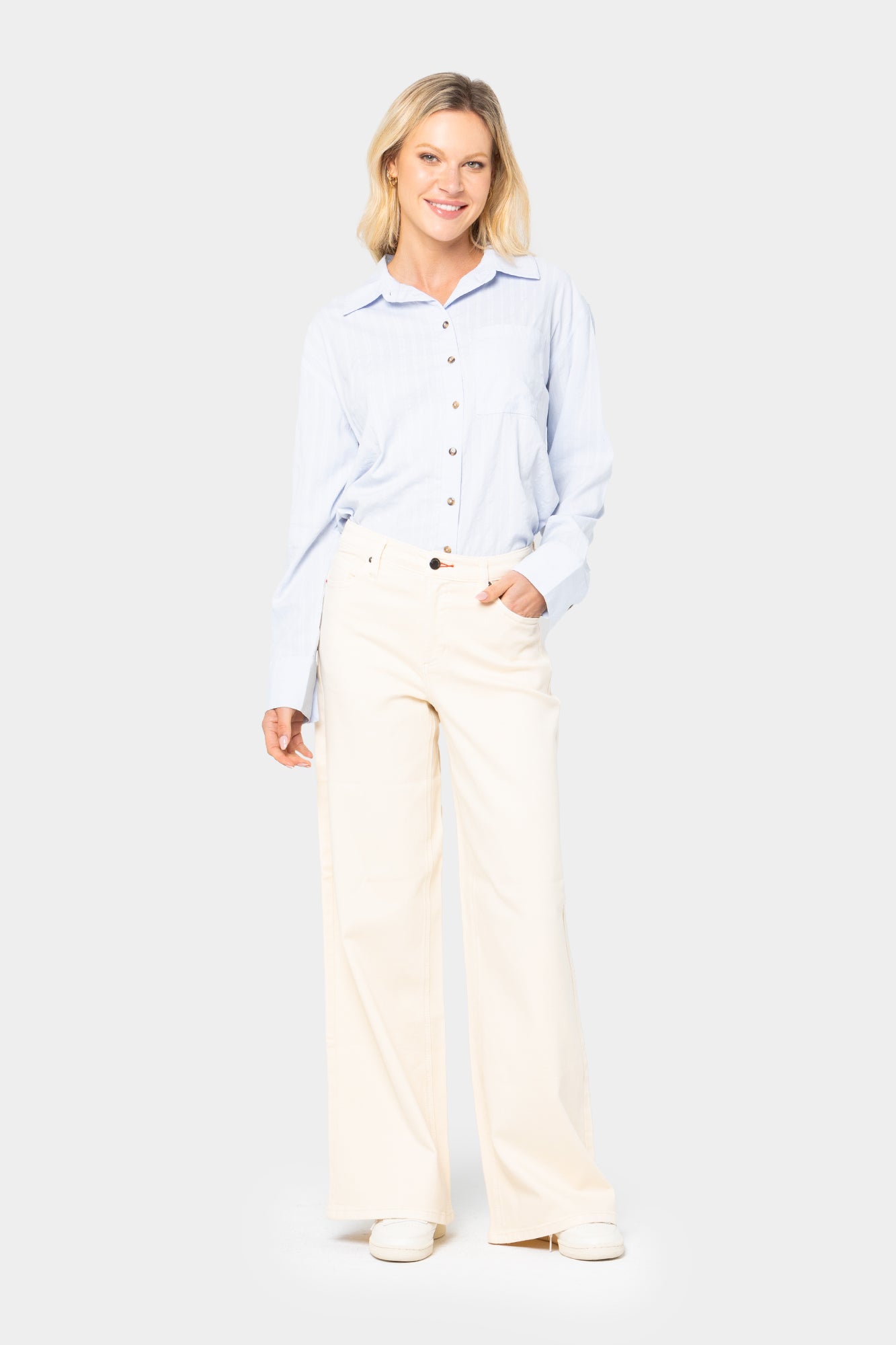 - Leg Shape: wide leg; widens fashionably from thigh to leg opening